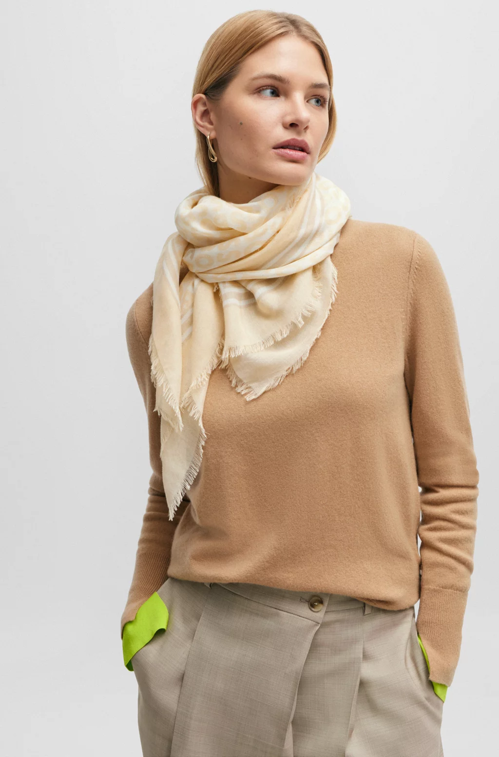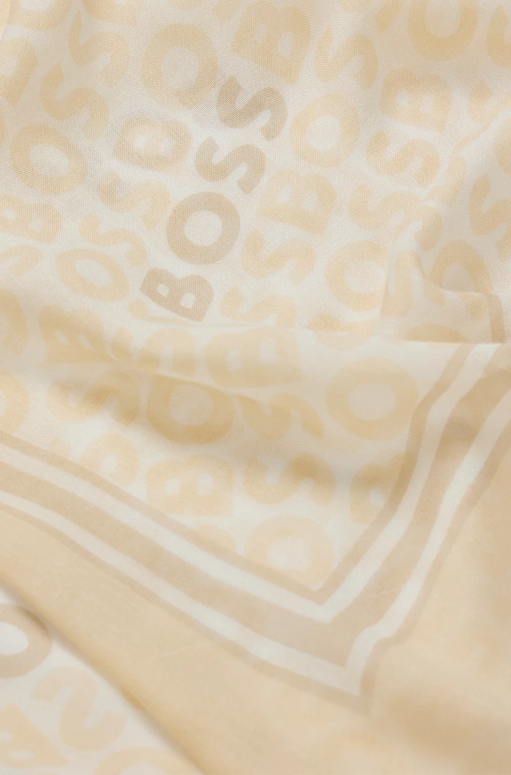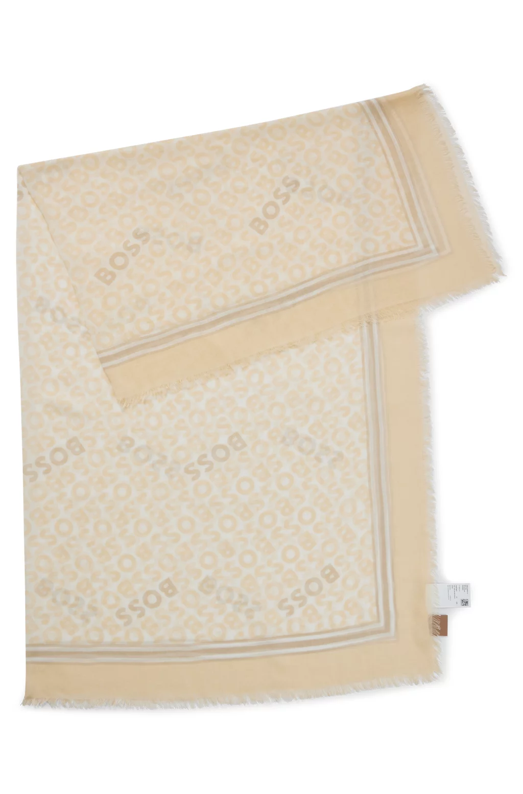 A signature scarf by BOSS, blended with a touch of wool and printed all over with logos. Measurements: 120 x 120cms.